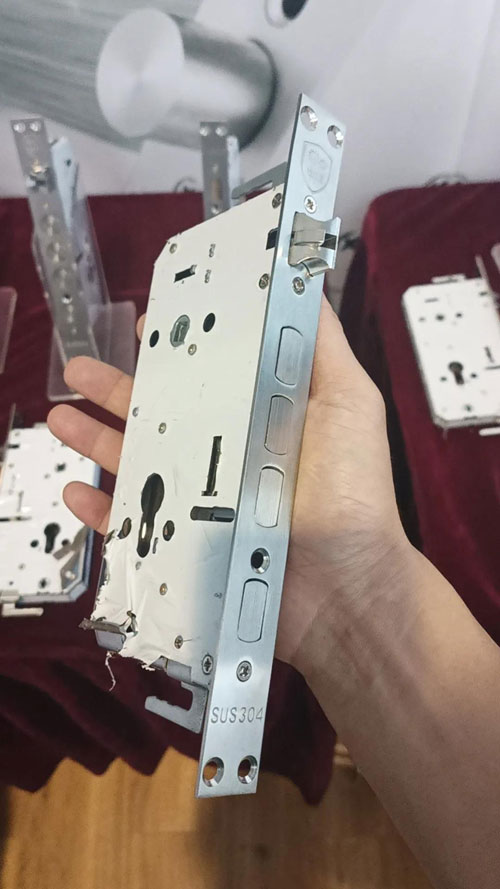 这一步检查主要是看原防盗门上锁体导向板的尺寸,跟指纹锁所带的锁体导向板尺寸是否一致?