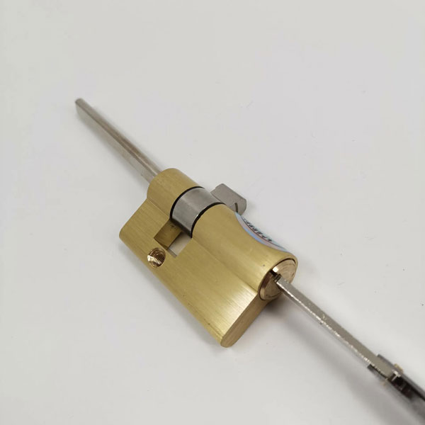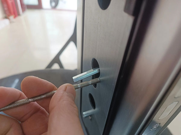 然后取一根长的方条插入内面板方条孔内,这个孔内必须要放一个弹簧在里面,插入的方条量出尺寸长度,后再将方条拿出来与插在锁体上的方条对比,量出方条所需要的长度,再用切割机将多余的方条切掉。